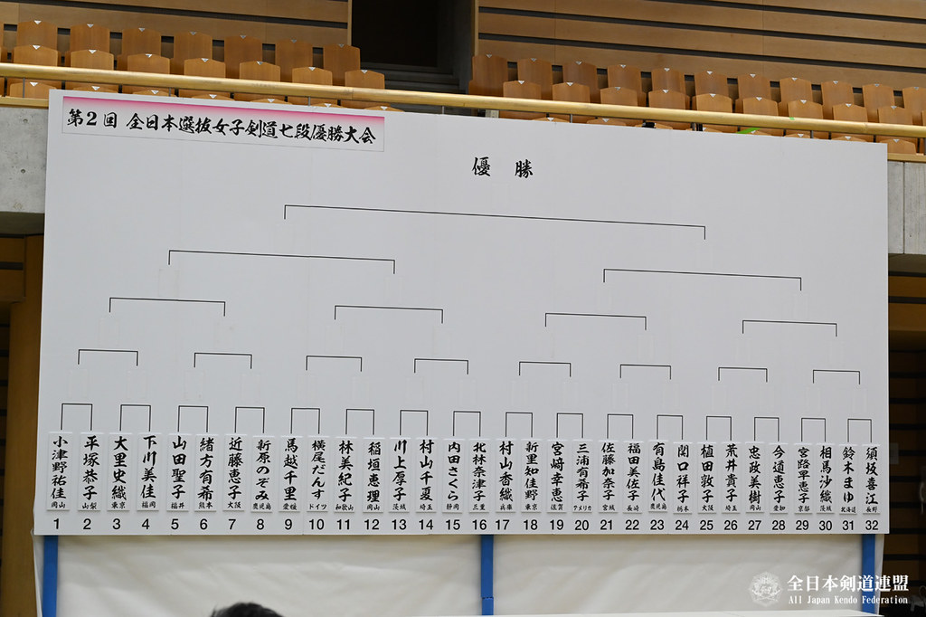 本大会は昨年から始まった「女子剣道七段戦」で、七段を取得した国内外の女性剣士32名が選出され、トーナメント形式で優勝を目指します。