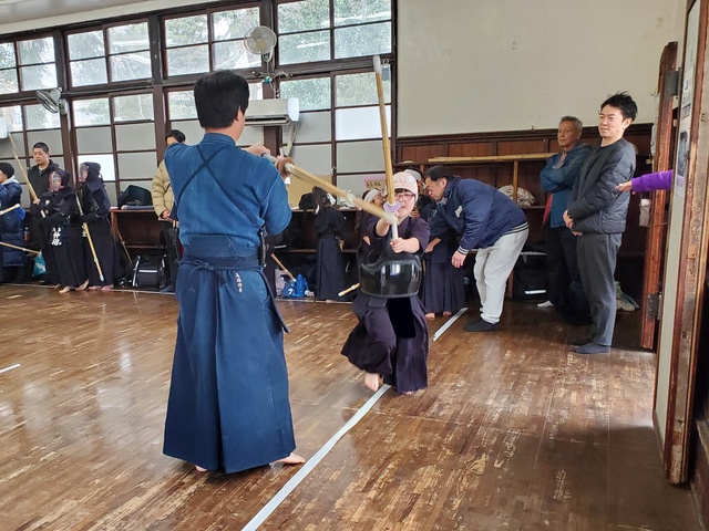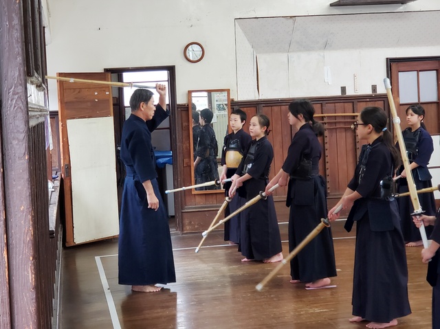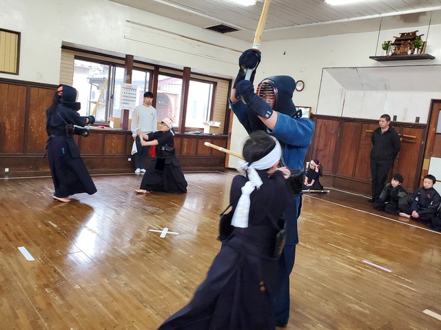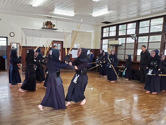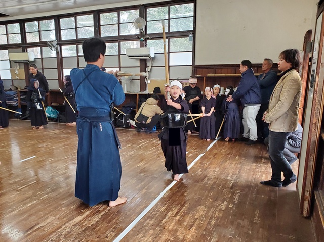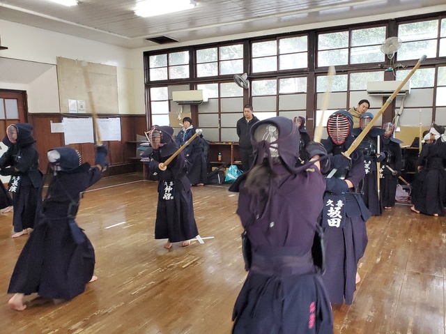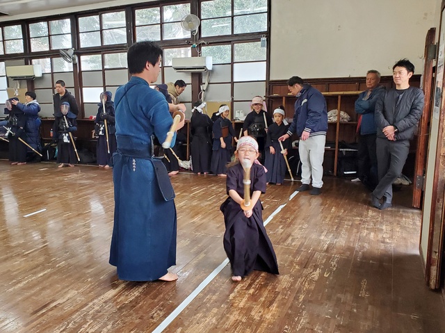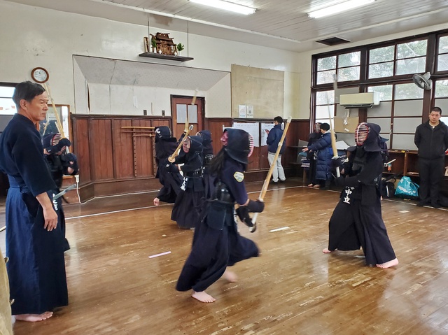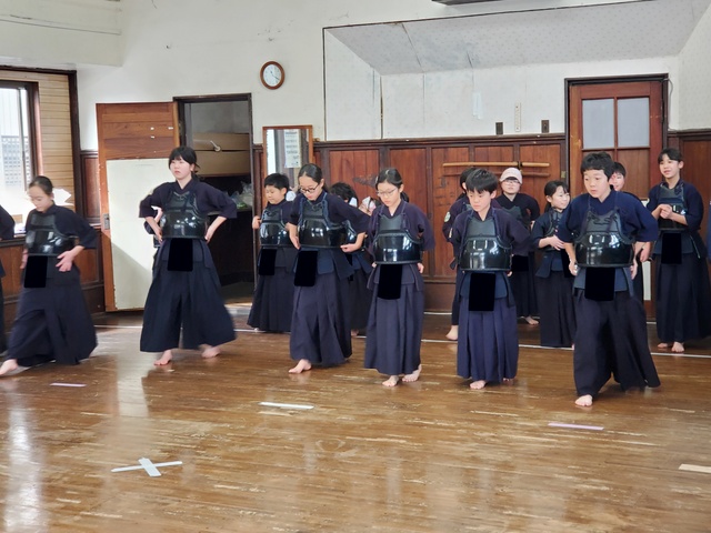 前進後退正面打ちを10本行った後、元立ちの先生と打ち込み稽古を行い、総合的に判定します。